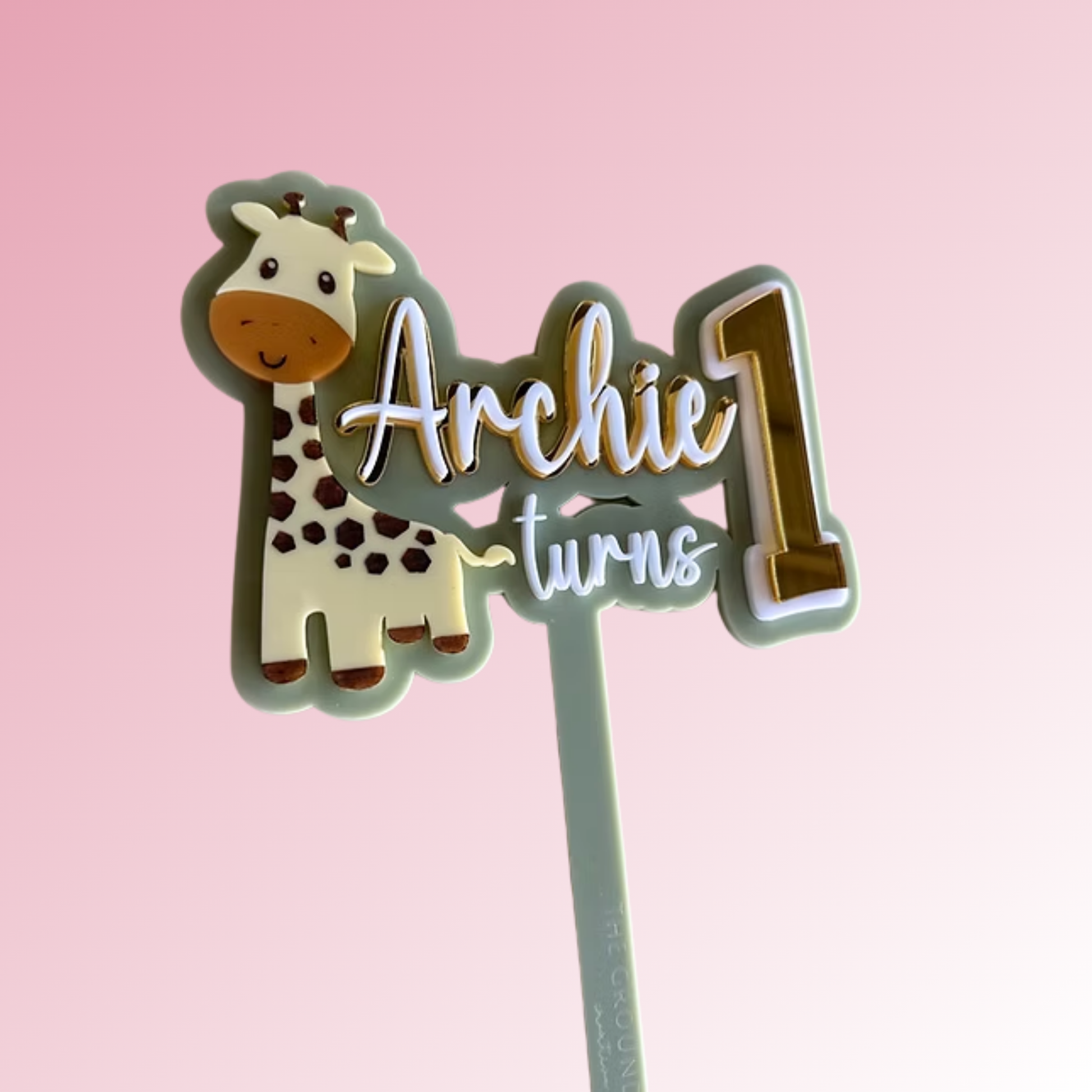 Our “Name turns Age – Giraffe” Acrylic Topper/Plaque is perfect for birthdays featuring your child’s name and age, bringing a charming giraffe design that adds a playful, whimsical vibe to any cake or party setup.